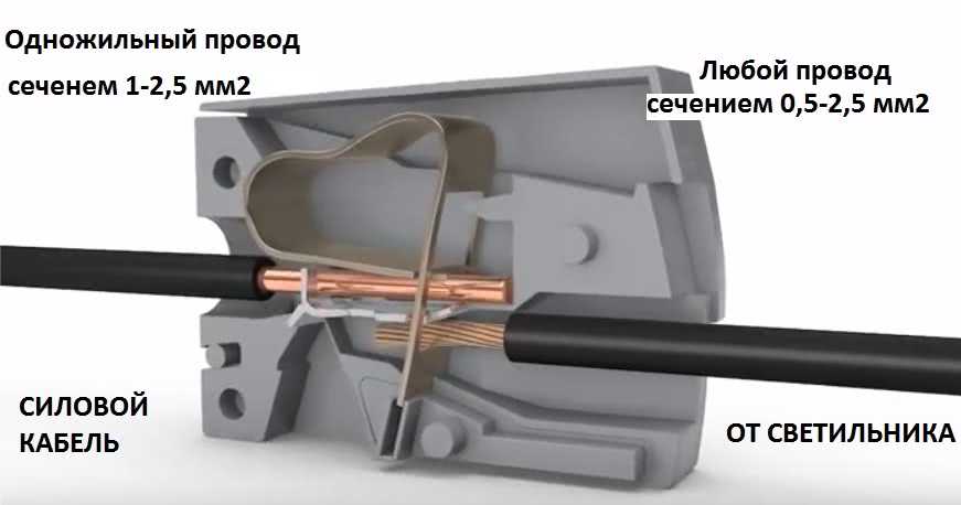 Внутри находится хромоникелевая (CrNi) пружина, которая обеспечивает должный контакт. Со стороны линии (подключаются провода с потолка или из стены) зажим самозажимной. С этой стороны стоит пружина, которую отжать может только достаточно жесткий проводник. Это моножила или маложильный жесткий провод. Диаметр подключаемых с этой стороны проводников — от 1 мм² до 2,5 мм² (маложильный рекомендован до 2,0 мм²)