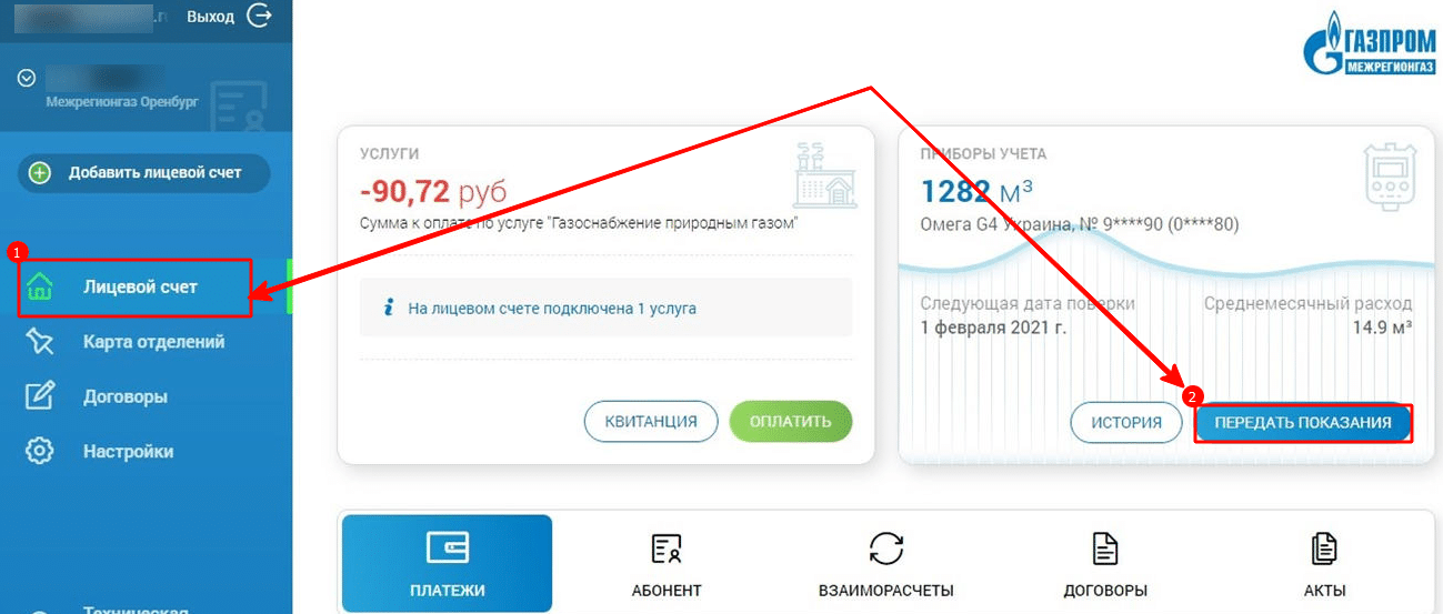 В личном кабинете Межрегионгаз слева перейдите в раздел Лицевые счета. Справа отображается страница с информацией по состоянию баланса и потреблению. Кликните на кнопку Передать показания в блоке Приборы учета.