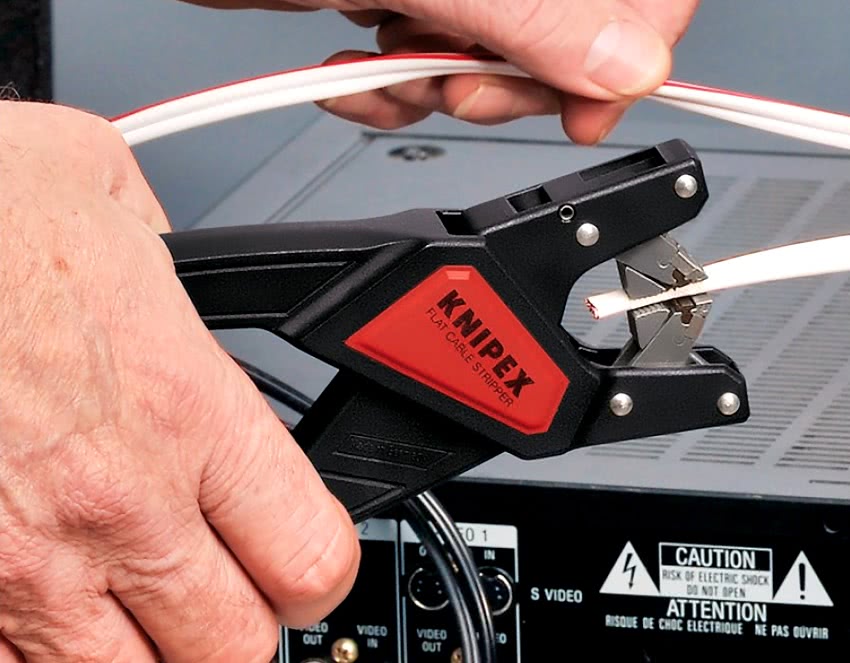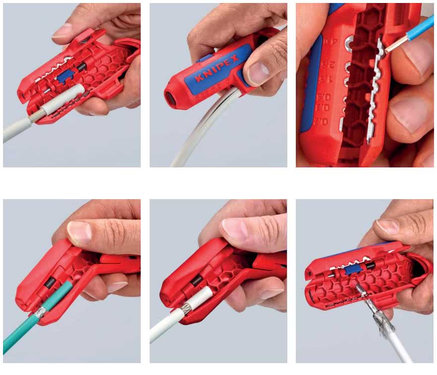 Для удаления изоляции с коаксиальных кабелей хорошей моделью является инструмент Knipex KN-166005SB. Он способен в один прием снять наружную оплетку, экран и изоляцию. Стриппер оснащен тремя встроенными ножами, для каждого из которых можно настроить глубину при помощи шестигранного ключа. Удаление изоляции осуществляется посредством прокручивания стриппера на 360°.