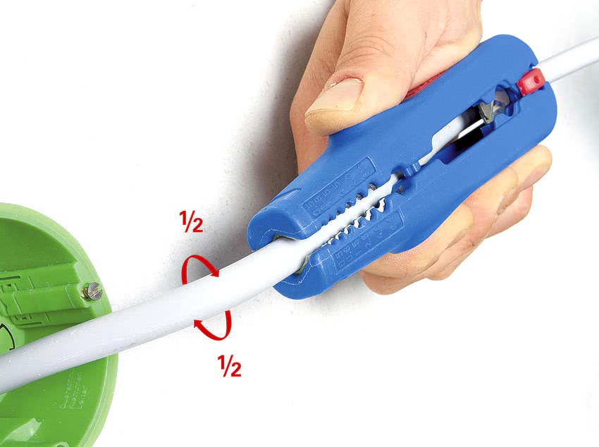 Просто пропускаете кабель через отверстие и с небольшим усилием вытягиваете стриппер на себя, разрезая изоляцию на необходимую длину. Такой способ идеально подходит для кабеля NYM.