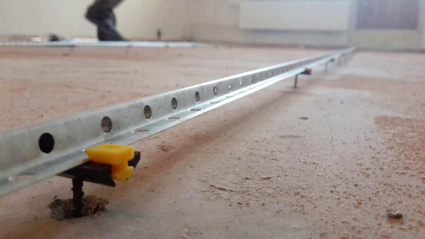 Единственное преимущество этого метода – маяки очень устойчивы. Даже после значительных механических повреждений металлический профиль можно заменить и сразу закрепить новый на имеющихся дюбелях. Недостаток – большая трудоемкость монтажа. К примеру, для комнаты 6×6 м требуется 4 ряда маяков, дюбеля забиваются на расстоянии 30 см, то всего придется высверливать 600:30×4=80 отверстий в бетонной плите. Затем в эти отверстия нужно крепить дюбели и каждый ровнять по горизонтали. За это время мастер не только сделает обыкновенные маяки на цементном растворе, но и начнет изготовление стяжки.