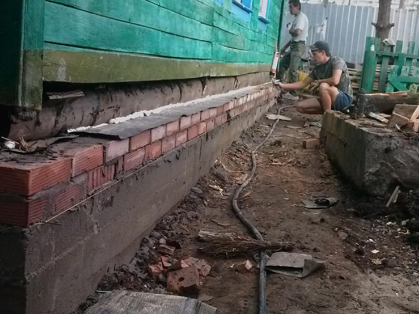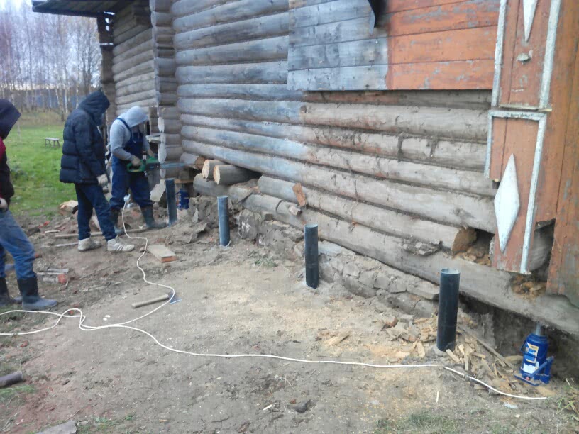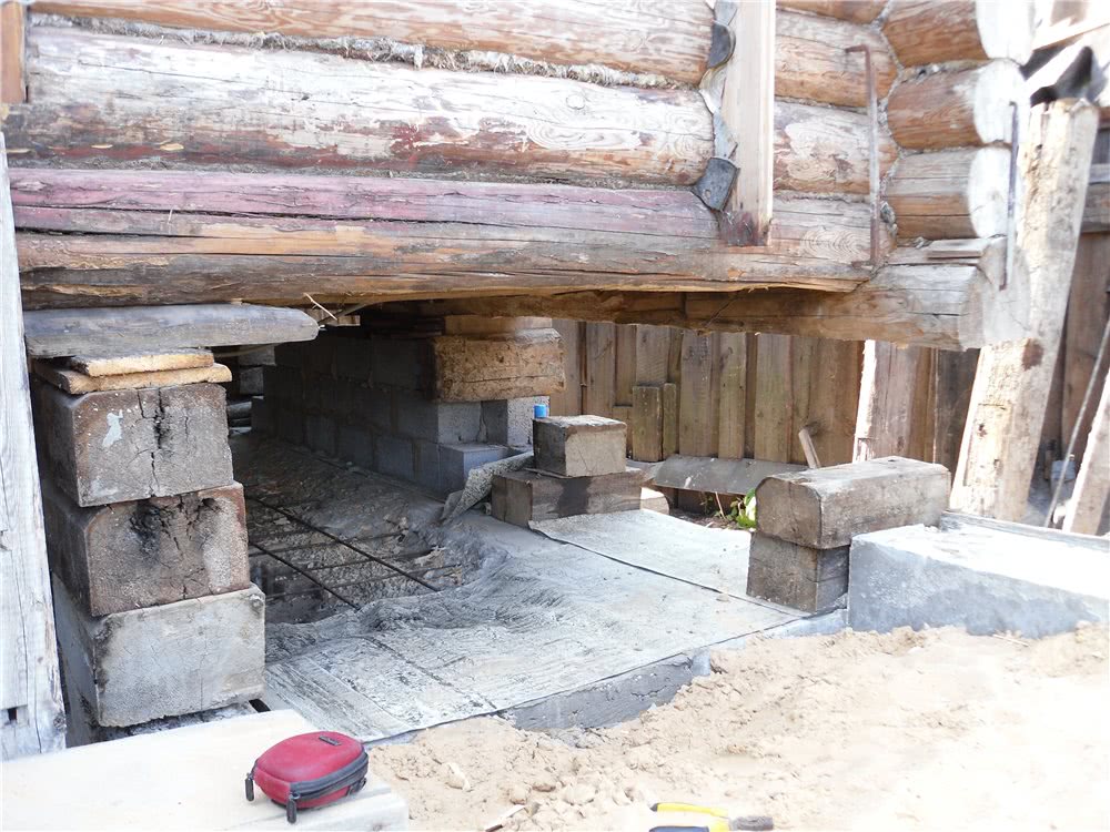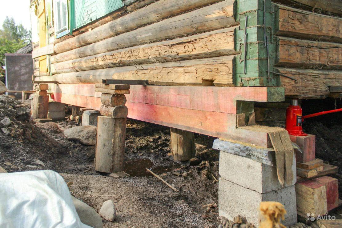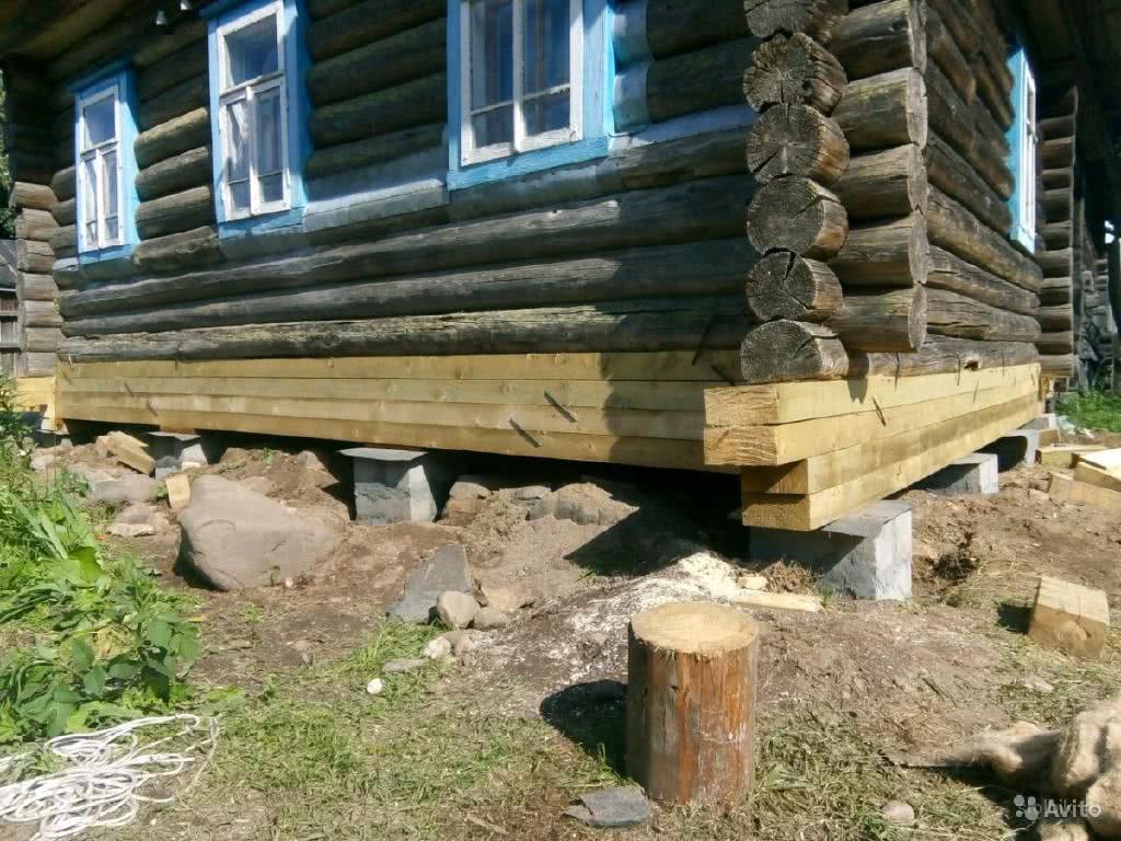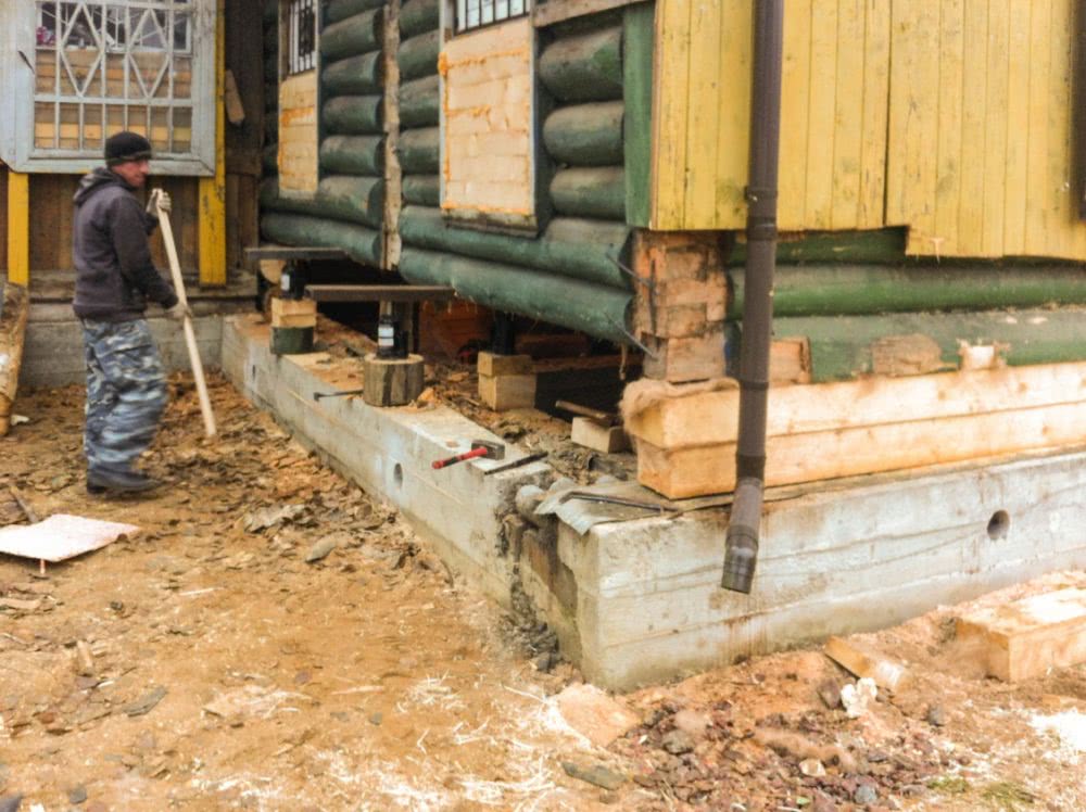 Ремонт часто осуществляют по технологии с разборкой основания. Во время работ дом приподнимают, нижний венец удаляют. Фундамент можно реставрировать, усилить или полностью заменить.