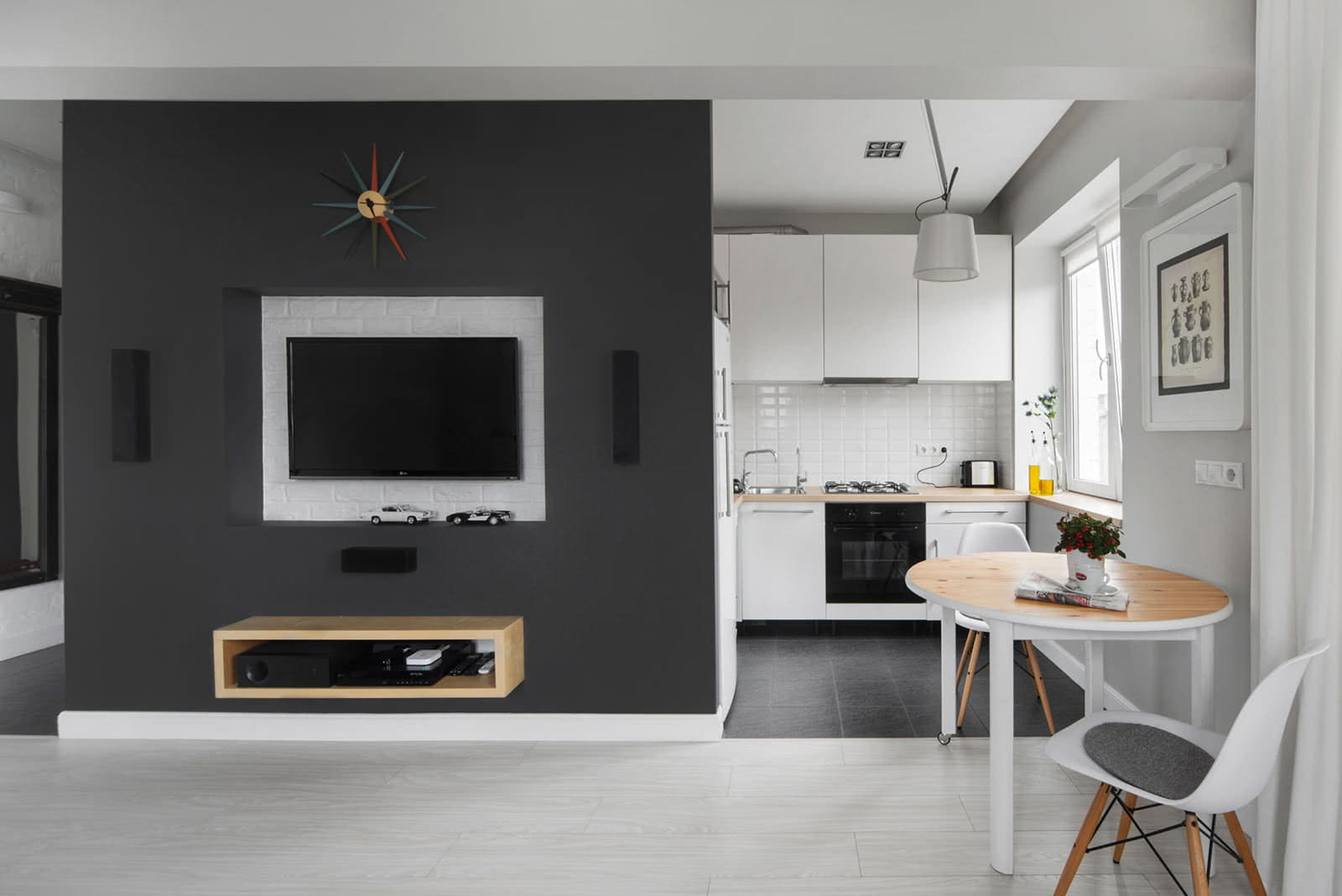 Объединение гостиной и кухни – самый распространенный способ увеличить реальную площадь, отведенную под бытовую технику и приготовление пищи. Как правило, для этого убирается перегородка между комнатами, что само по себе дает дополнительное пространство. В некоторых случаях разумно убрать не всю перегородку, а ее часть, таким образом задача увеличения площади будет решена, но одновременно сохранится функциональное зонирование.