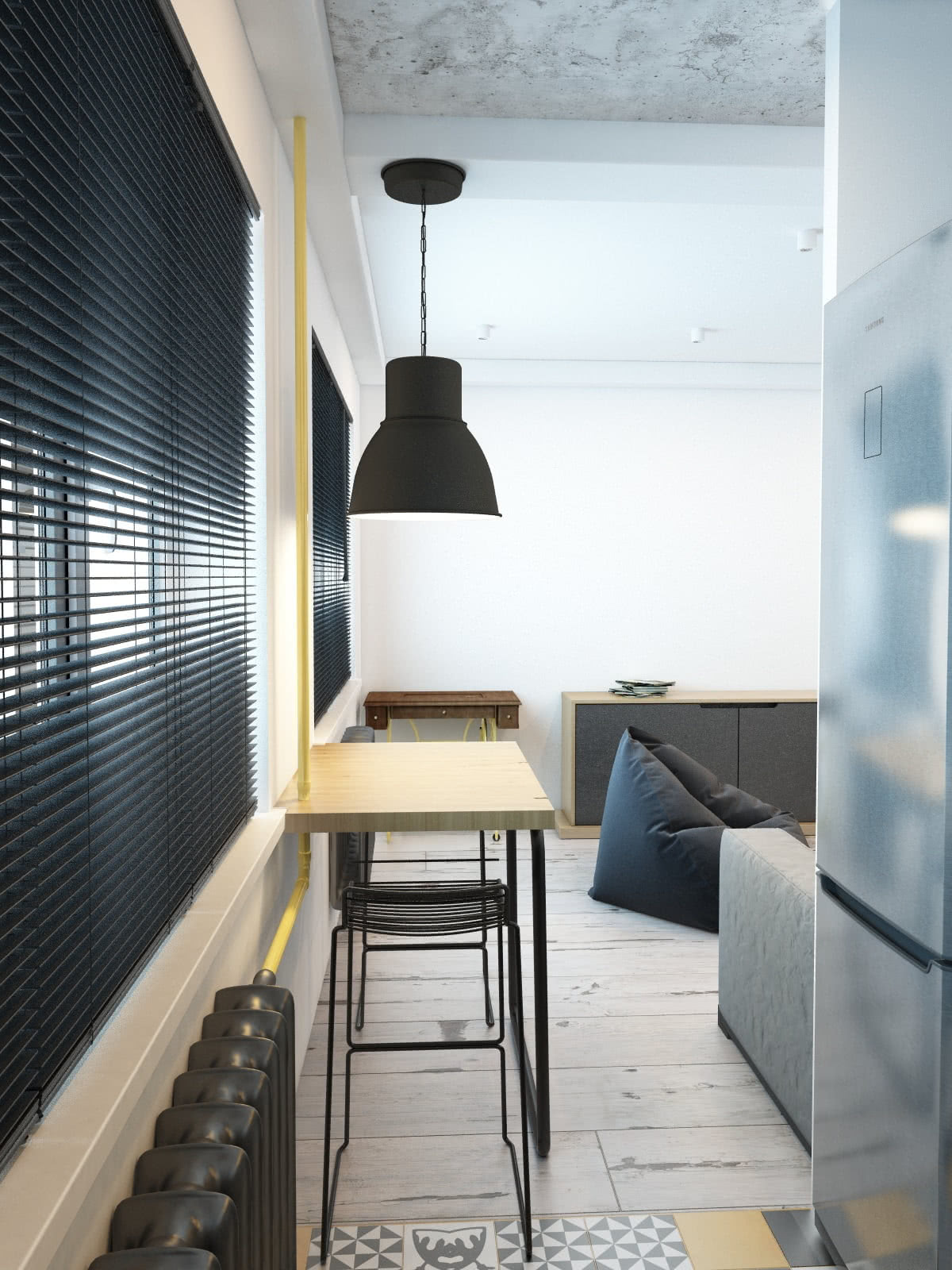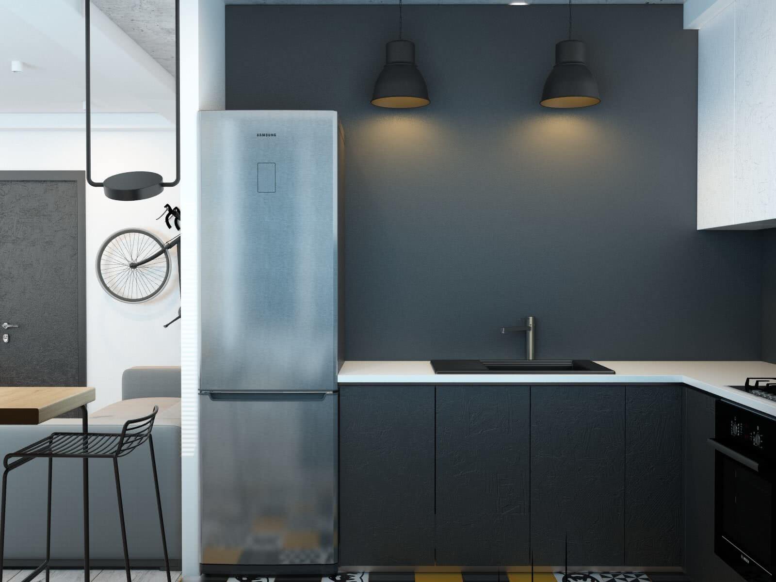 Если отказываться от стандартного холодильника не планируется, его стоит поставить в самый дальний угол помещения или встроить в нишу.