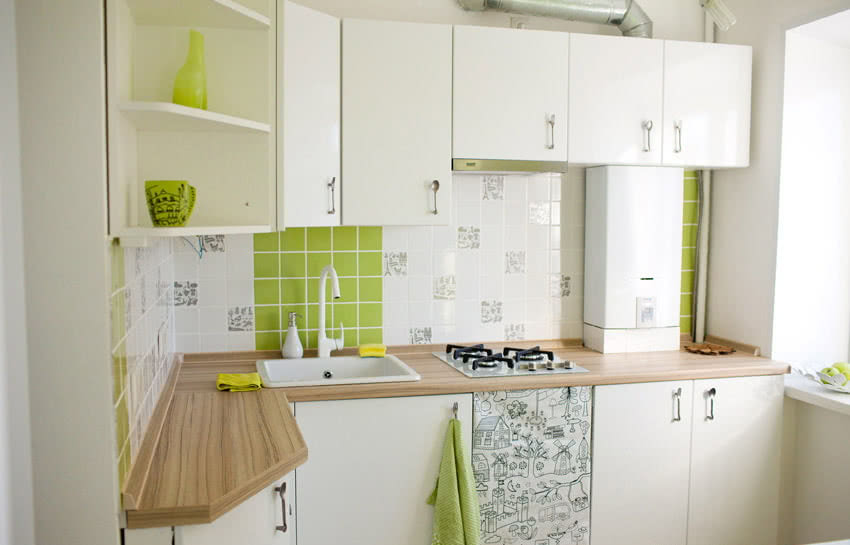 Сохранились варианты кухонь в хрущевке с газовой колонкой. Современные колонки выглядят современно и стильно, но, тем не менее, вписываются не в любой интерьер. Если вид колонки вас не устраивает, ее можно перенести в ванную комнату или «спрятать».
