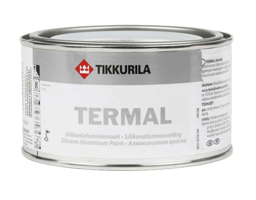 Краска Термал (Termal) от финского производителя Tikkurila. Изготавливают ее на основе алкидных смол и выпускают в черном и серебристом цвете. Она способна выдержать нагрев металла в той стадии, когда он становится красным. При использовании такой краски на банных печах она не трескается и не облезает около 3 лет