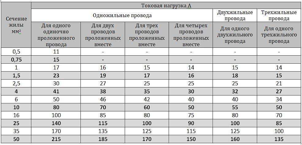 Узнав мощность, которая будет действовать на проводку, можно подобрать ее сечение из таблицы. Не будем рассматривать все показатели данной таблицы, покажем те, которые преобладают в быту.