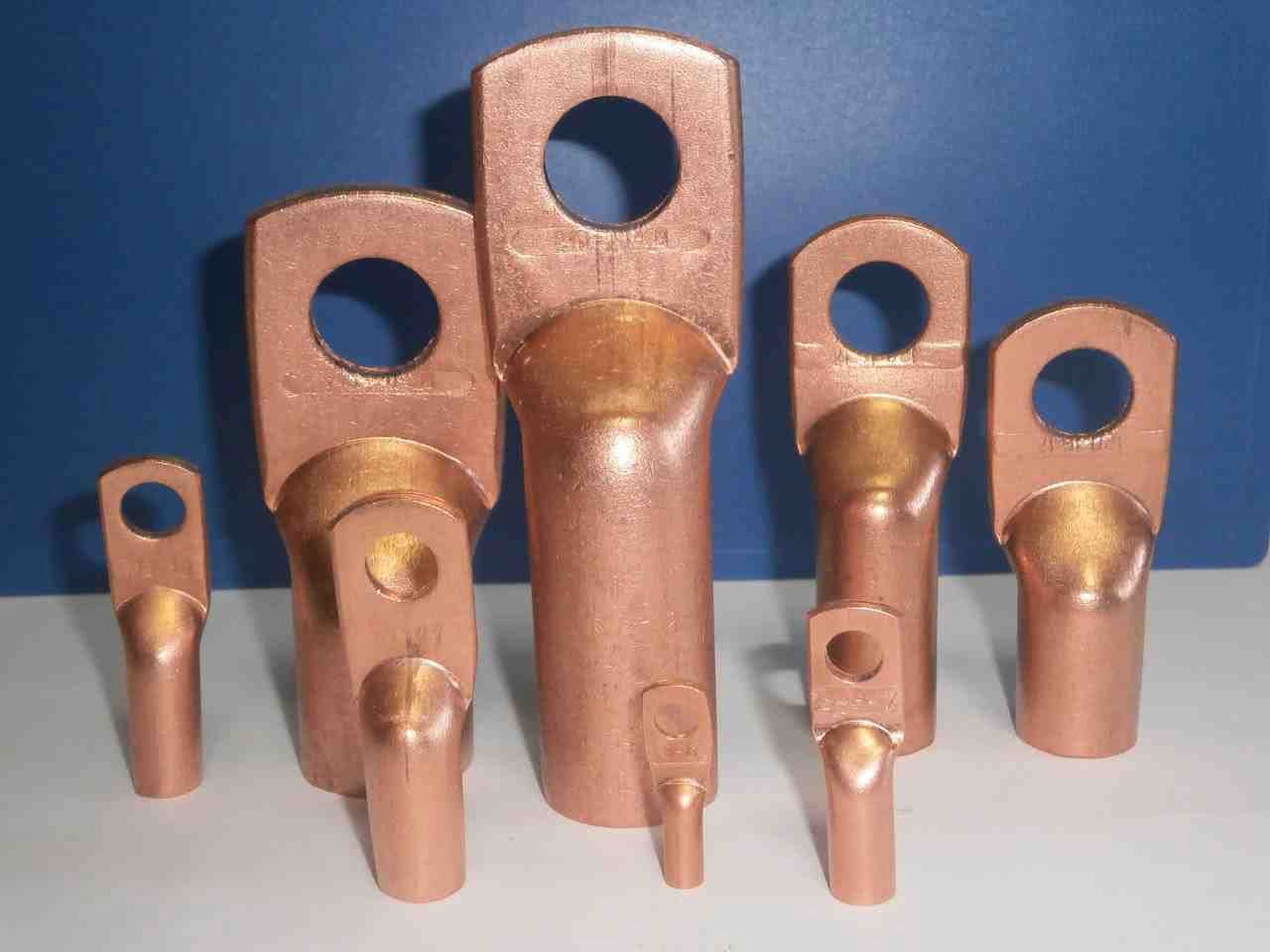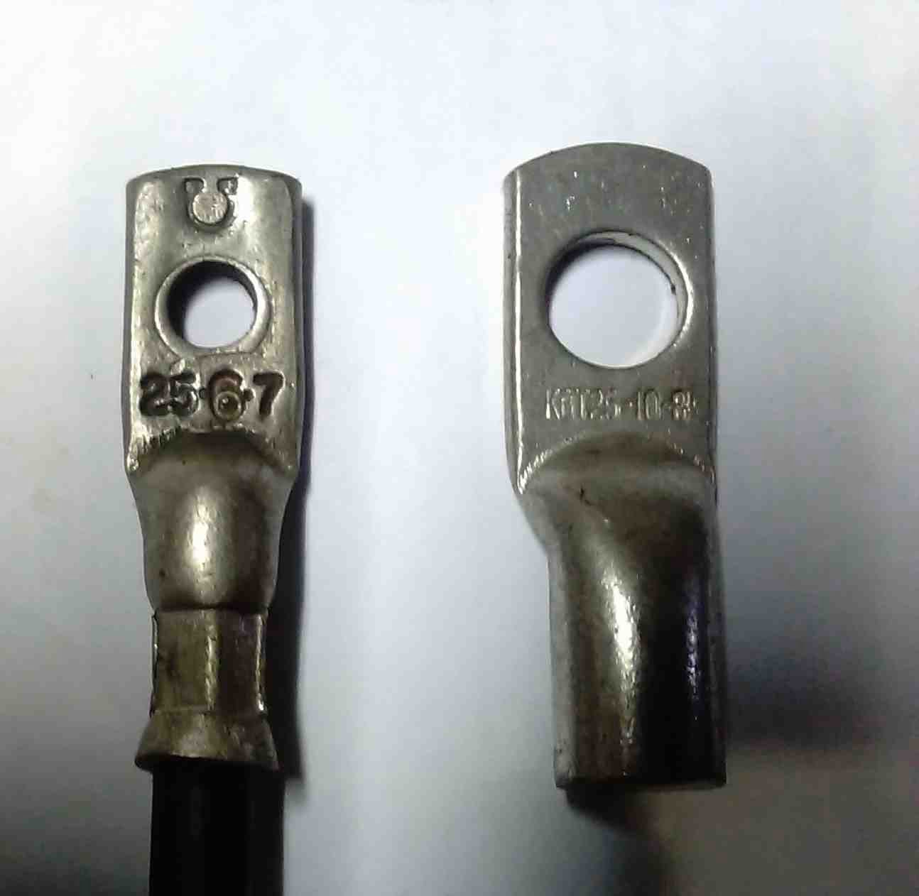 Ещё один способ — это использование наконечников. Наконечник похож на кусочек трубки, разрезанной и развёрнутой в плоскость с одной стороны. В плоской части просверлено отверстие для болта. Наконечники позволяют соединять кабеля любого диаметра в любом сочетании. При необходимости соединить медный кабель с алюминиевым используют специальные наконечники, у которых одна часть медная, а другая алюминиевая. Также возможен вариант, при котором между наконечниками прокладывается шайба, латунная или медная лужёная.