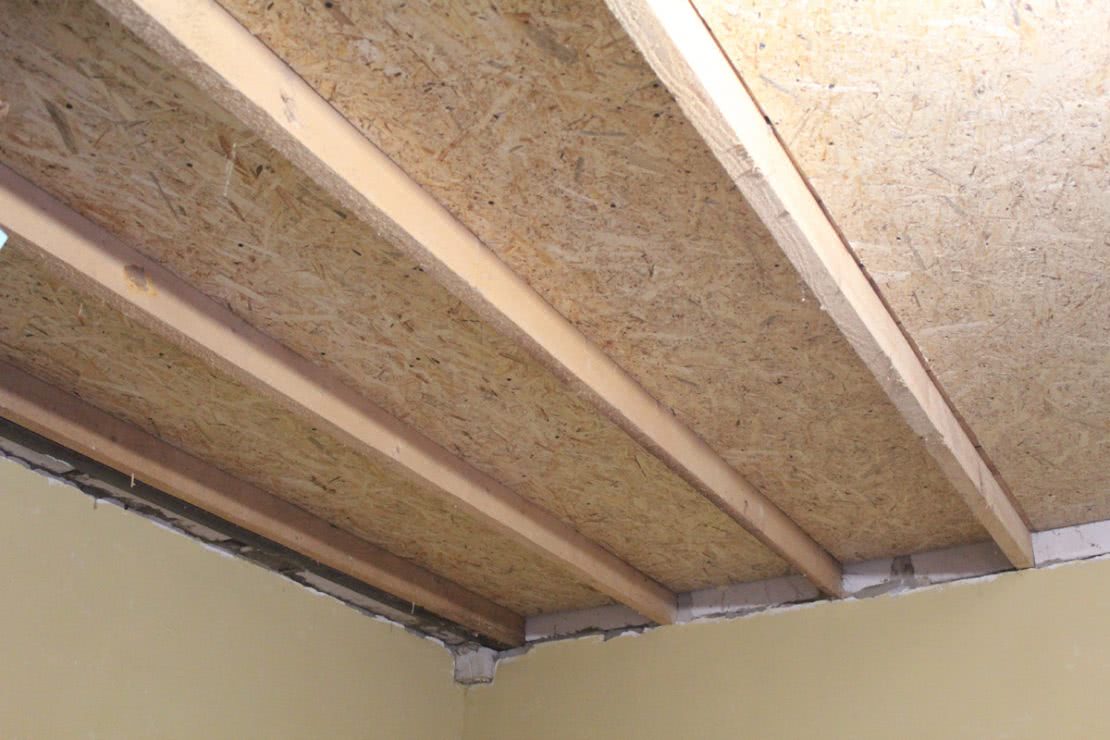 Чтобы завершить основание на нижнем этаже, подшивают потолочное покрытие. Можно использовать гипсокартон, доски или вагонку. Верхняя часть перекрытия тоже подготовлена для настила полов.